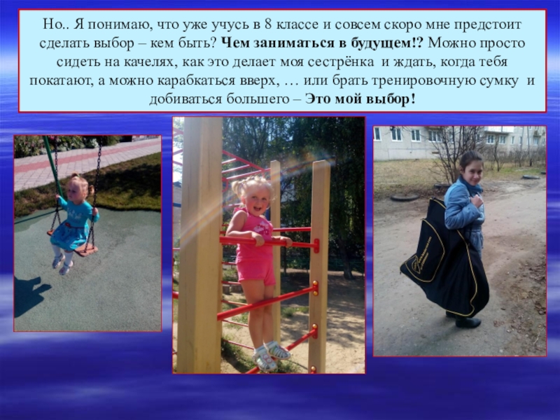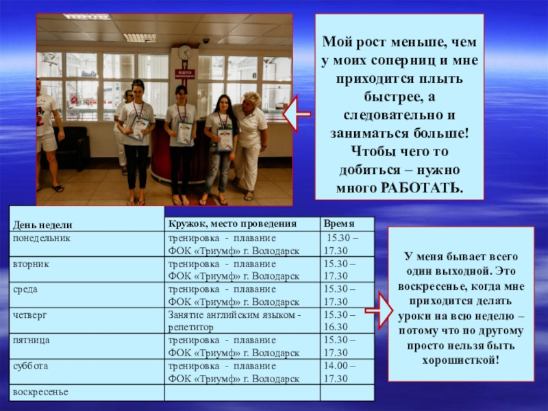 Мой рост меньше, чем у моих соперниц и мне приходится плыть быстрее, а следовательно и заниматься больше! Чтобы чего то добиться – нужно много РАБОТАТЬ.