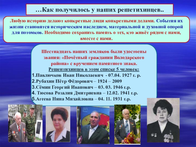 Шестнадцать наших земляков были удостоены звания: «Почётный гражданин Володарского района» с вручением памятного знака. Решентихинцев в этом списке 5 человек: