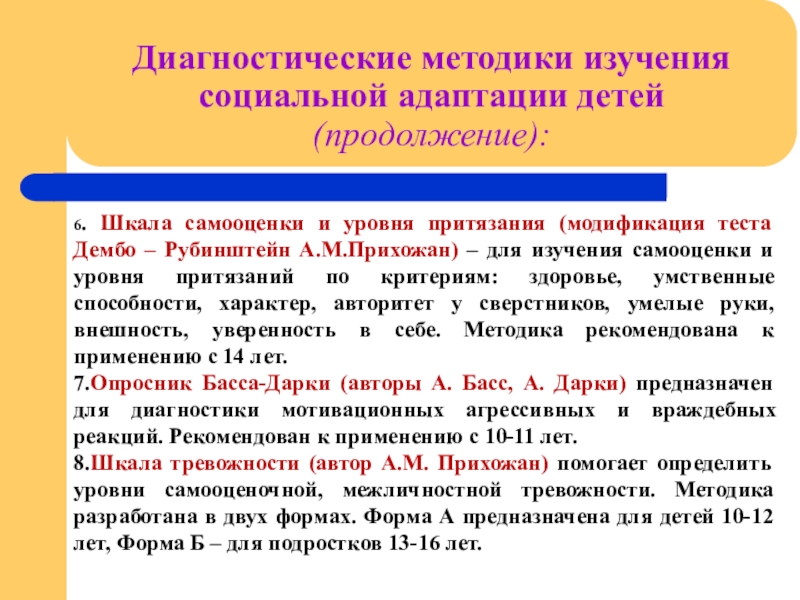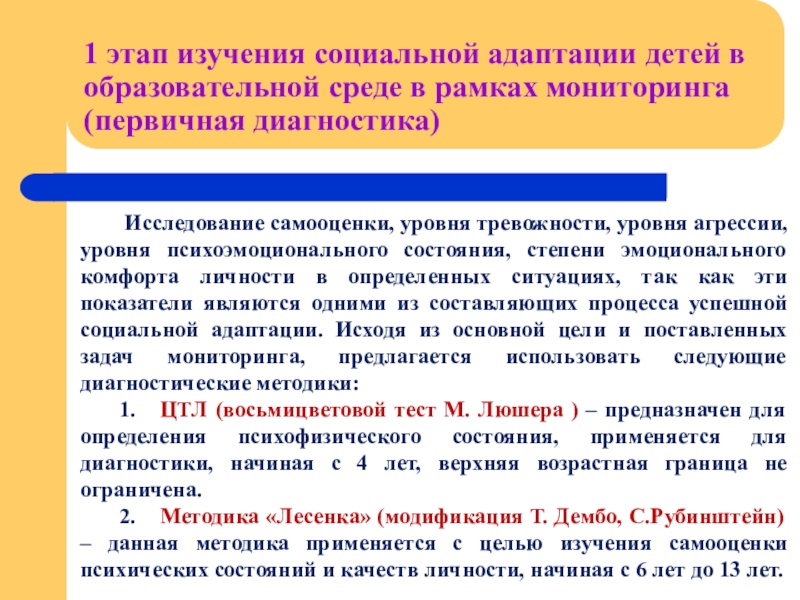 Исследование самооценки, уровня тревожности, уровня агрессии, уровня психоэмоционального состояния, степени эмоционального комфорта личности в определенных ситуациях, так как эти показатели являются одними из составляющих процесса успешной социальной адаптации. Исходя из основной цели и поставленных задач мониторинга, предлагается использовать следующие диагностические методики: