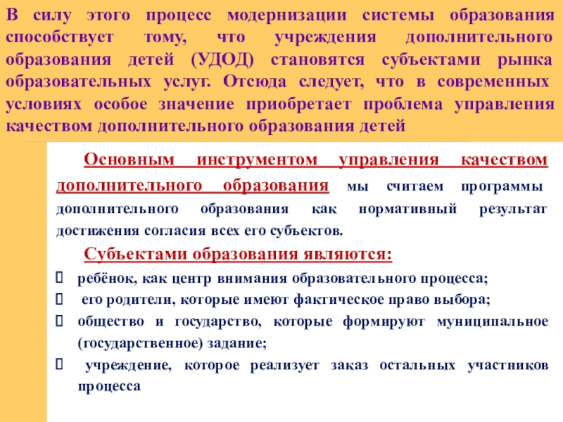 Основным инструментом управления качеством дополнительного образования мы считаем программы дополнительного образования как нормативный результат достижения согласия всех его субъектов.