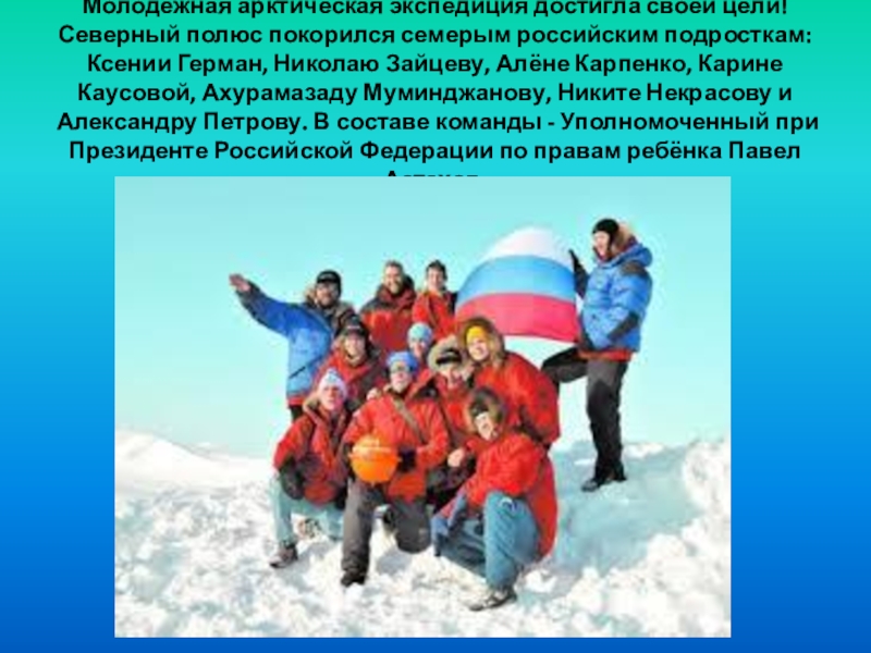 Слайд 16Молодёжная арктическая экспедиция достигла своей цели! Северный полюс покорился семерым российским