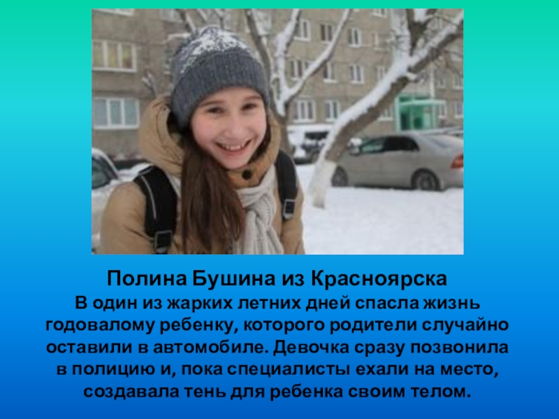 Полина Бушина из Красноярска В один из жарких летних дней спасла жизнь годовалому ребенку, которого родители случайно