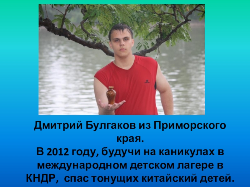 Дмитрий Булгаков из Приморского края. В 2012 году, будучи на каникулах в международном детском лагере в КНДР,
