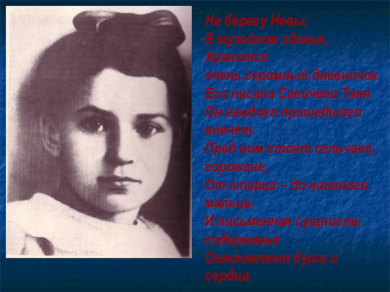 На берегу Невы,В музейном зданье,Хранитсяочень скромный дневничок.Его писала Савичева ТаняОн каждого пришедшего влечёт.Пред ним стоят сельчане, горожане,От