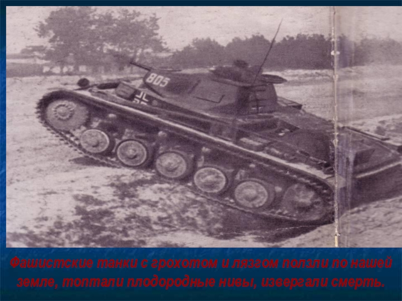 Слайд 5Фашистские танки с грохотом и лязгом ползли по нашей земле, топтали