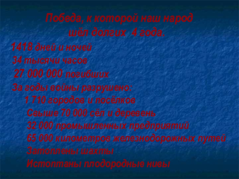 Победа, к которой наш народ шёл долгих 4 года. 1418 дней и ночей 34 тысячи часов 27 000 000 погибших