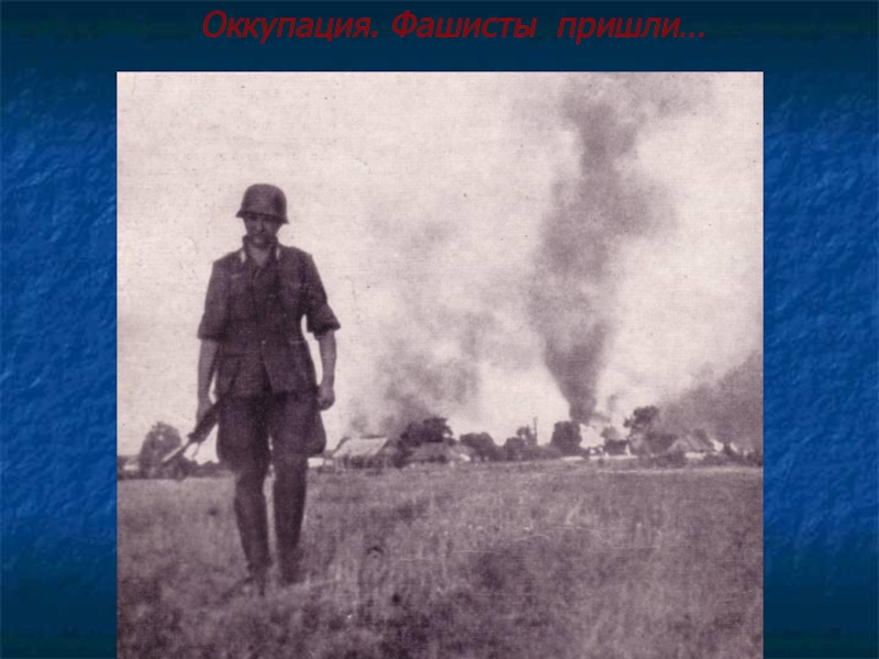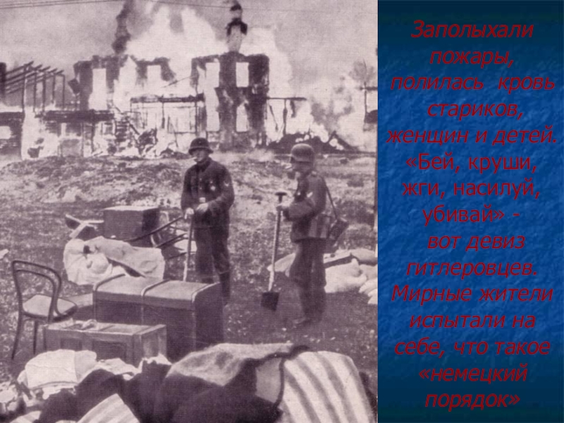 Заполыхали пожары, полилась кровь стариков, женщин и детей.«Бей, круши, жги, насилуй, убивай» - вот девиз гитлеровцев.Мирные жители