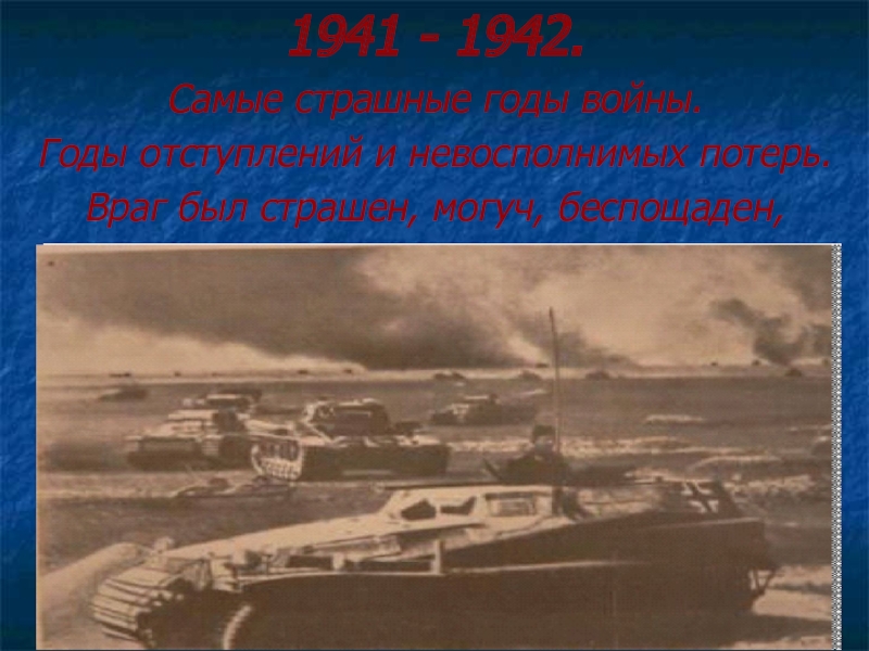 1941 - 1942. Самые страшные годы войны.Годы отступлений и невосполнимых потерь.Враг был страшен, могуч, беспощаден,