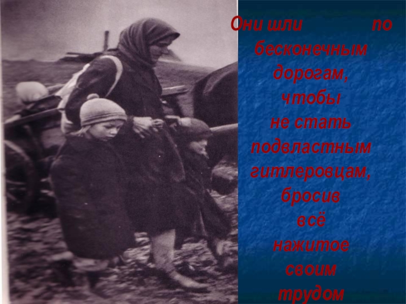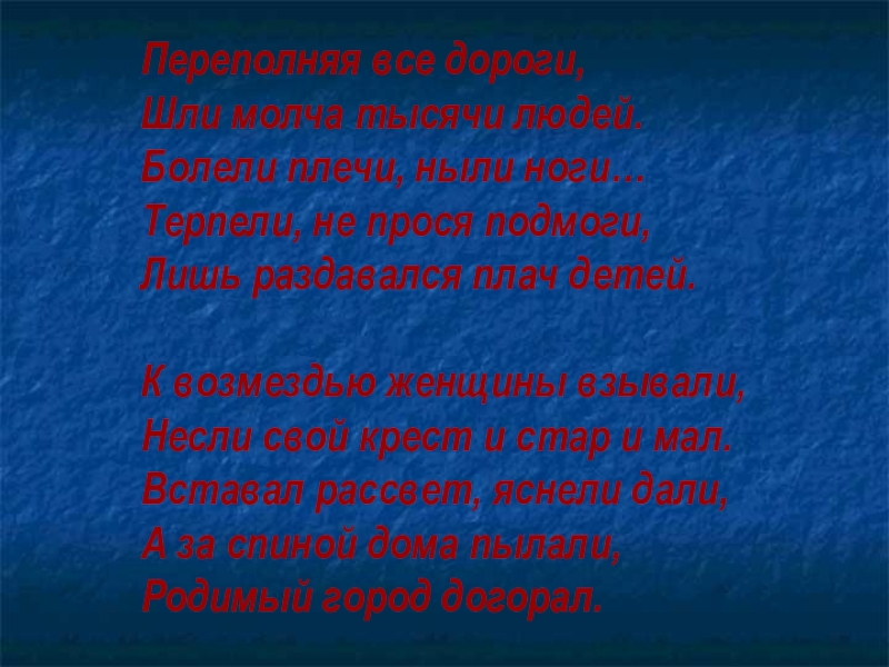 Переполняя все дороги,Шли молча тысячи людей.Болели плечи, ныли ноги…Терпели, не прося подмоги,Лишь раздавался плач детей.К возмездью женщины
