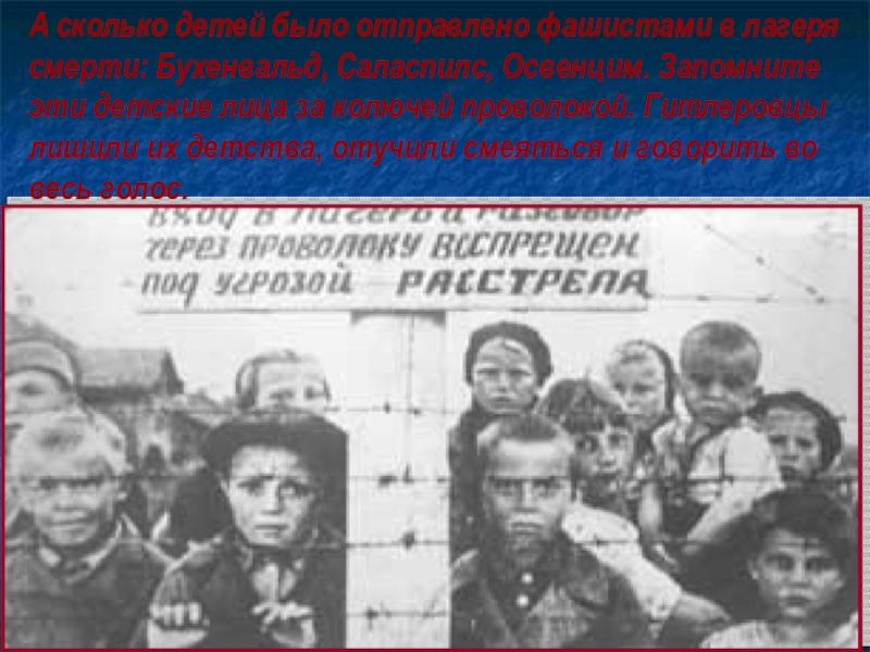 А сколько детей было отправлено фашистами в лагеря смерти: Бухенвальд, Саласпилс, Освенцим. Запомните эти детские лица за