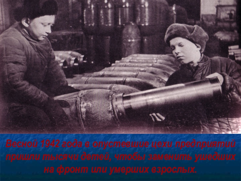 Слайд 35Весной 1942 года в опустевшие цехи предприятий пришли тысячи детей, чтобы