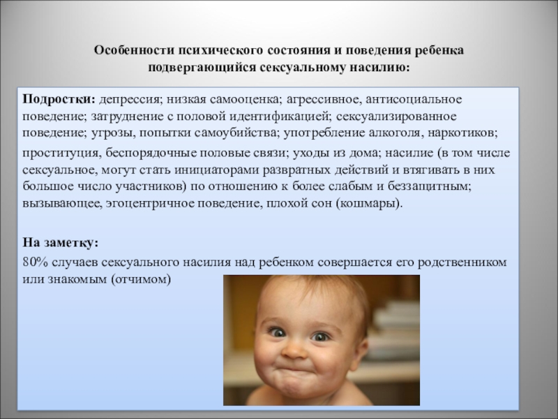 Слайд 9Особенности психического состояния и поведения ребенка подвергающийся сексуальному насилию: