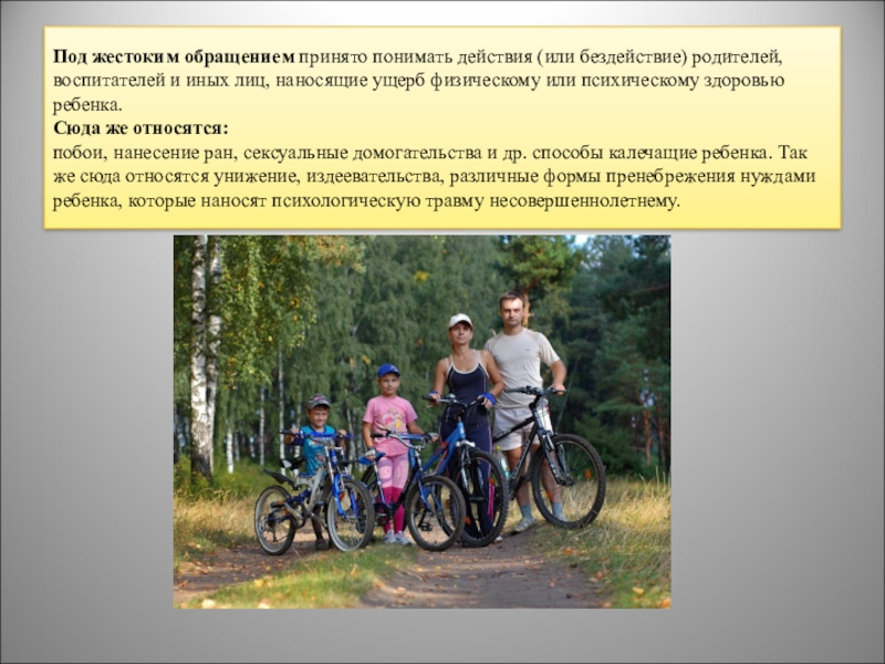 Слайд 2Под жестоким обращением принято понимать действия (или бездействие) родителей, воспитателей и