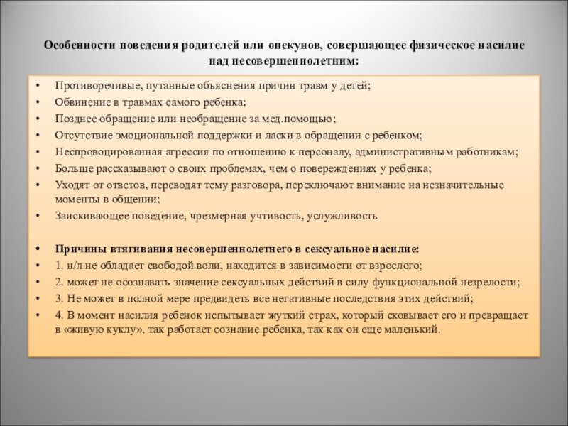 Слайд 8Особенности поведения родителей или опекунов, совершающее физическое насилие над несовершеннолетним:
