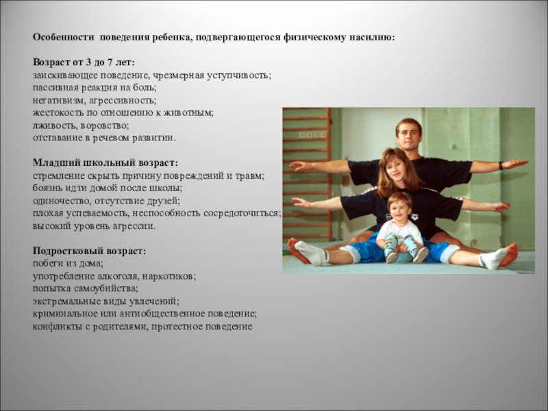 Слайд 7Особенности поведения ребенка, подвергающегося физическому насилию: