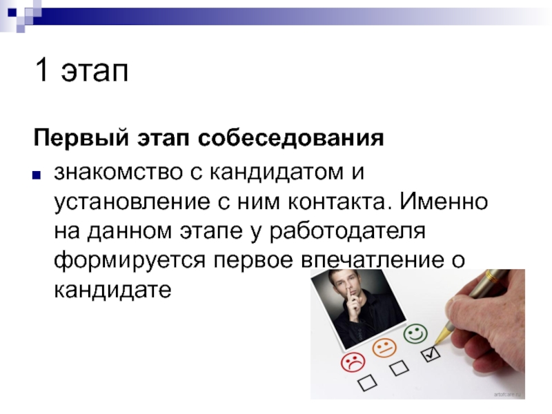 1 этапПервый этап собеседованиязнакомство с кандидатом и установление с ним контакта. Именно на данном этапе у работодателя