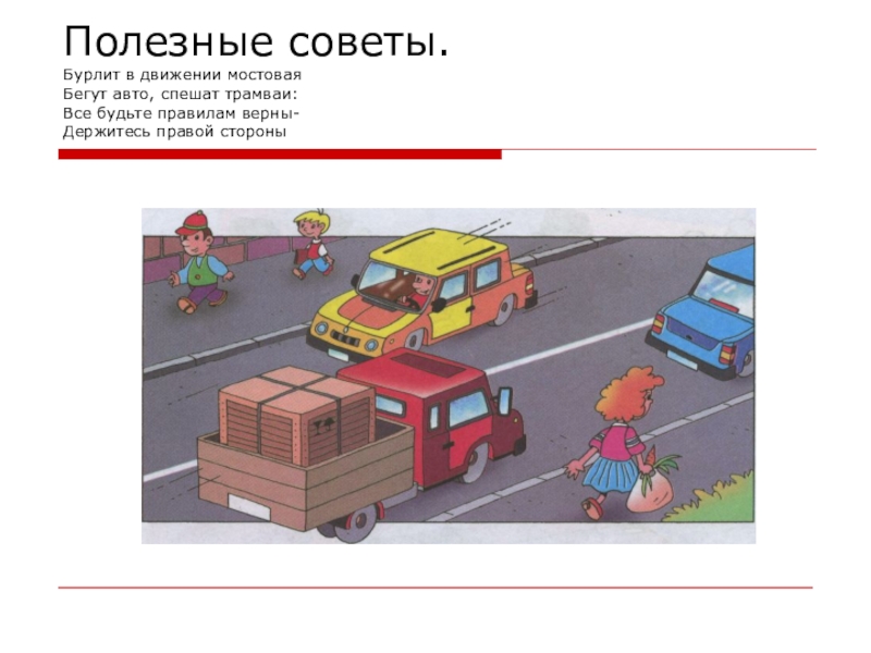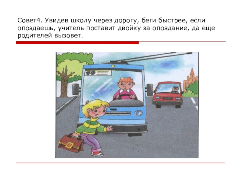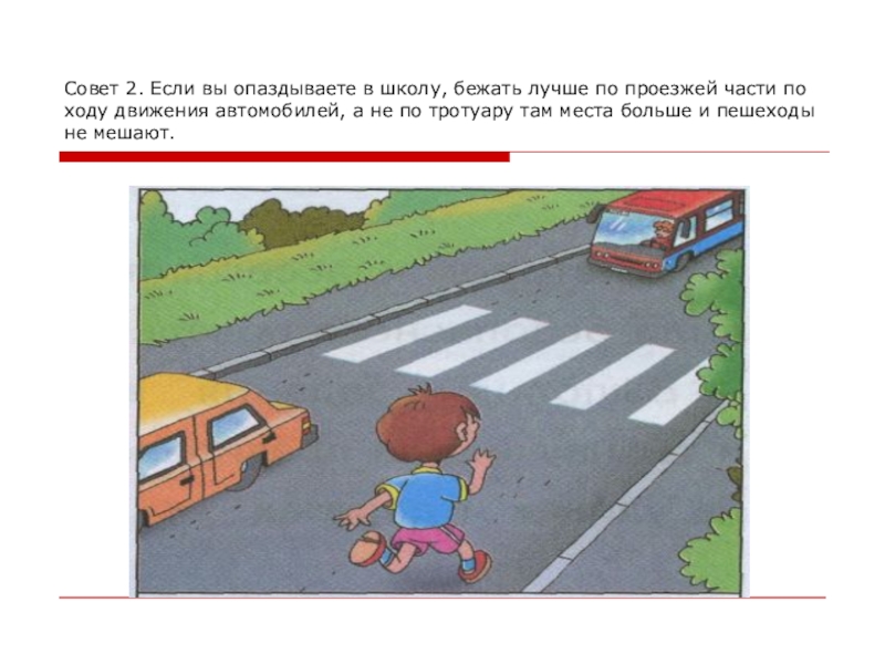 • Переходить дорогу нужно только в установленном месте, а не по кратчайшему пути. Не пытайтесь перебежать дорогу перед близко идущим транспортом.