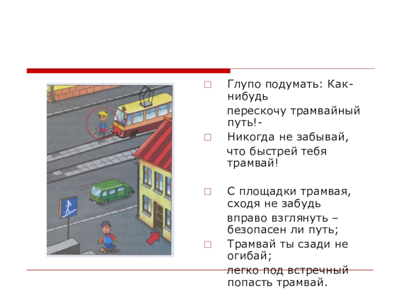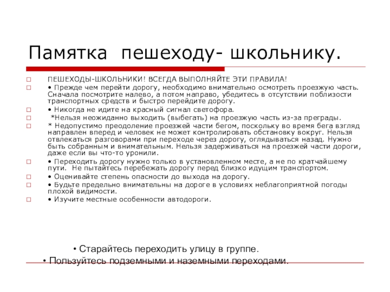 * Недопустимо преодоление проезжей части бегом, поскольку во время бега взгляд направлен вперед и человек не может контролировать обстановку вокруг. Нельзя отвлекаться разговорами при переходе через дорогу, оглядываться назад. Нужно быть собранным и внимательным. Нельзя задерживаться на проезжей части дороги, даже если вы что-то уронили.