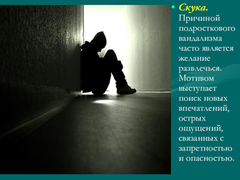Слайд 45Скука. Причиной подросткового вандализма часто является желание развлечься. Мотивом выступает поиск