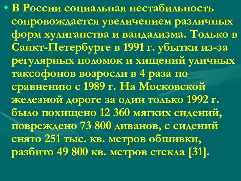 Только в Санкт-Петербурге в 1991 г. убытки из-за регулярных поломок и хищений уличных таксофонов возросли в 4 раза по сравнению с 1989 г. На Московской железной дороге за один только 1992 г. было похищено 12 360 мягких сидений, повреждено 73 800 диванов, с сидений снято 251 тыс. кв. метров обшивки, разбито 49 800 кв. метров стекла [31].