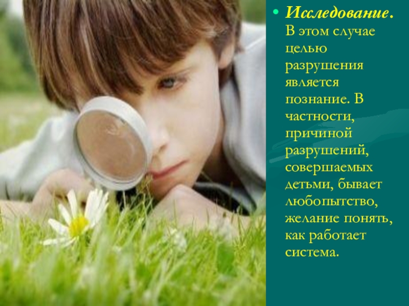 Слайд 46Исследование. В этом случае целью разрушения является познание. В частности, причиной
