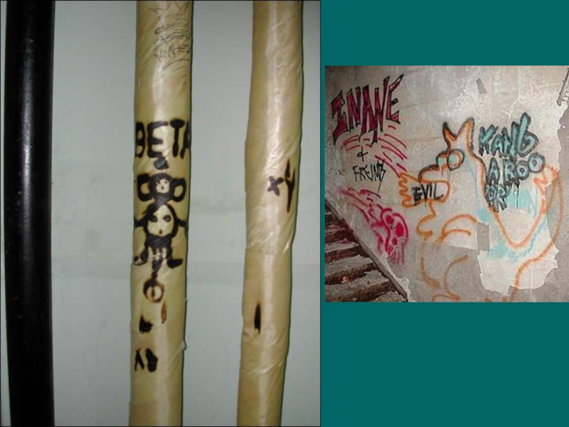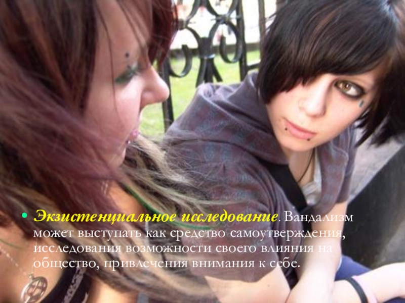Слайд 47Экзистенциальное исследование. Вандализм может выступать как средство самоутверждения, исследования возможности своего