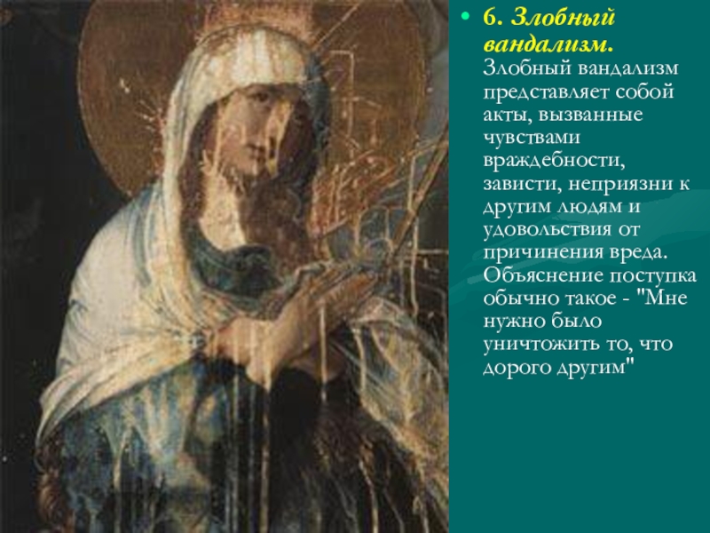Слайд 426. Злобный вандализм. Злобный вандализм представляет собой акты, вызванные чувствами враждебности,