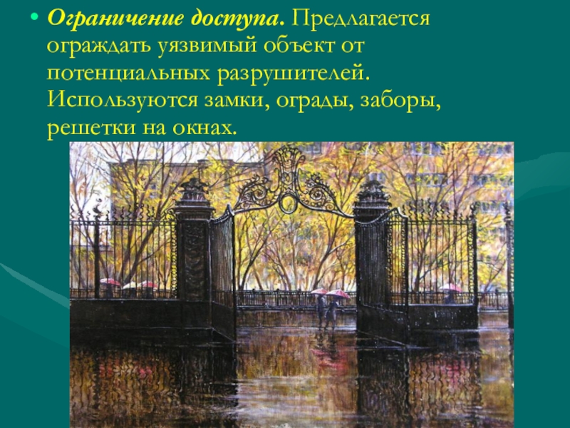 Слайд 60Ограничение доступа. Предлагается ограждать уязвимый объект от потенциальных разрушителей. Используются замки,