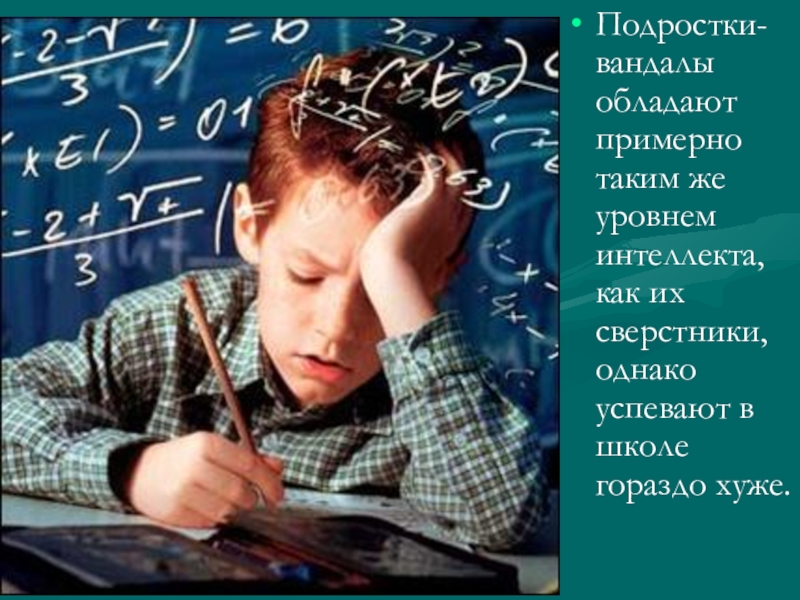 Слайд 50Подростки-вандалы обладают примерно таким же уровнем интеллекта, как их сверстники, однако