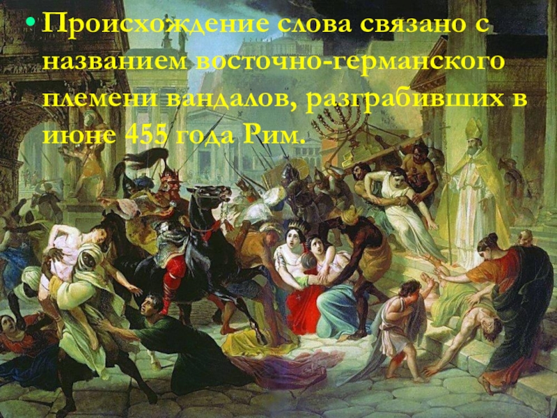 Слайд 3Происхождение слова связано с названием восточно-германского племени вандалов, разграбивших в июне