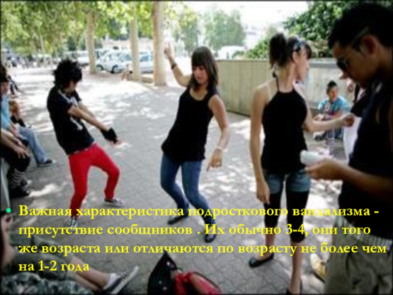 Слайд 53Важная характеристика подросткового вандализма - присутствие сообщников . Их обычно 3-4,