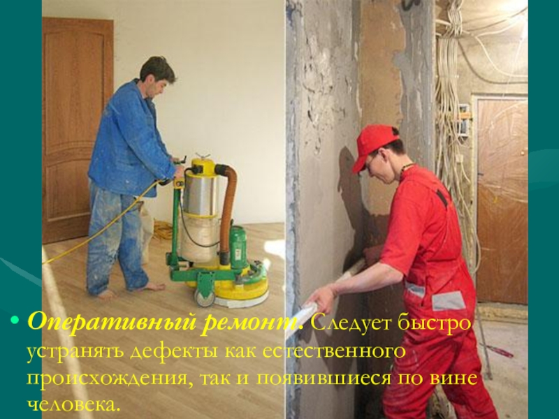 Слайд 59Оперативный ремонт. Следует быстро устранять дефекты как естественного происхождения, так и