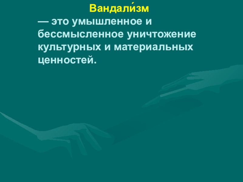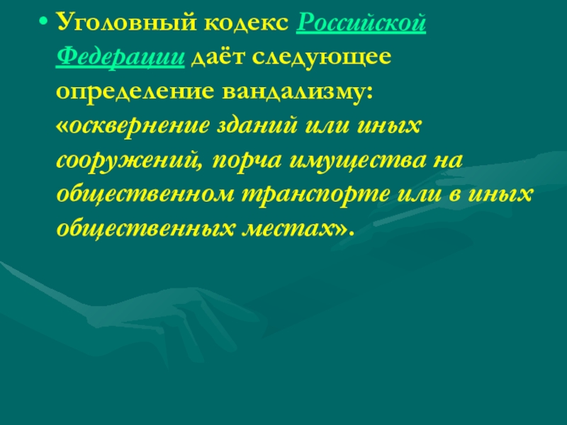 Слайд 4Уголовный кодекс Российской Федерации даёт следующее определение вандализму: «осквернение зданий или