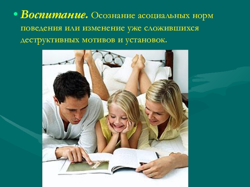 Слайд 66Воспитание. Осознание асоциальных норм поведения или изменение уже сложившихся деструктивных мотивов