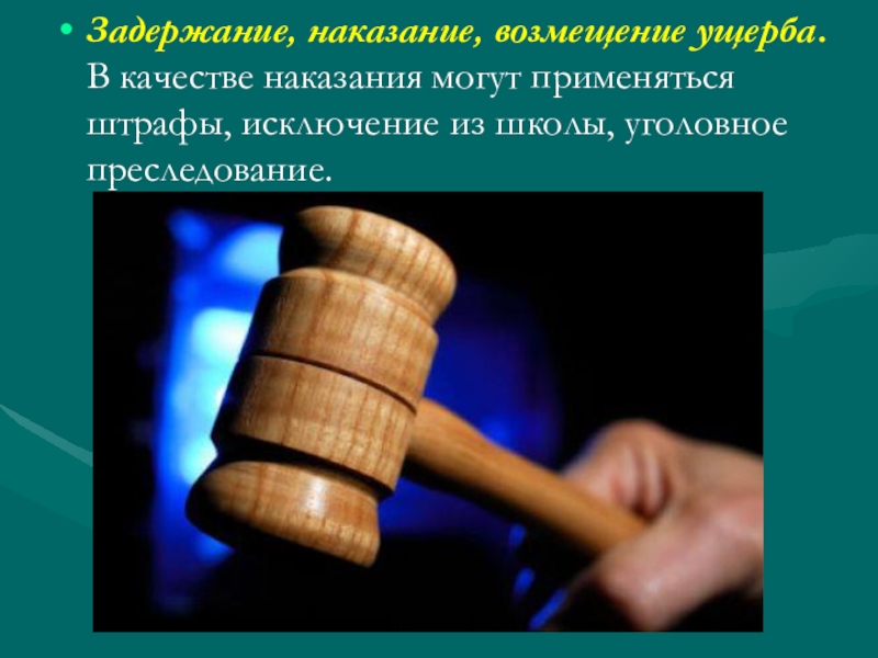 Слайд 63Задержание, наказание, возмещение ущерба. В качестве наказания могут применяться штрафы, исключение