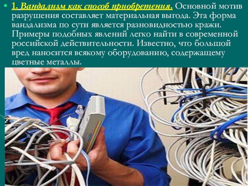 Слайд 371. Вандализм как способ приобретения. Основной мотив разрушения составляет материальная выгода.