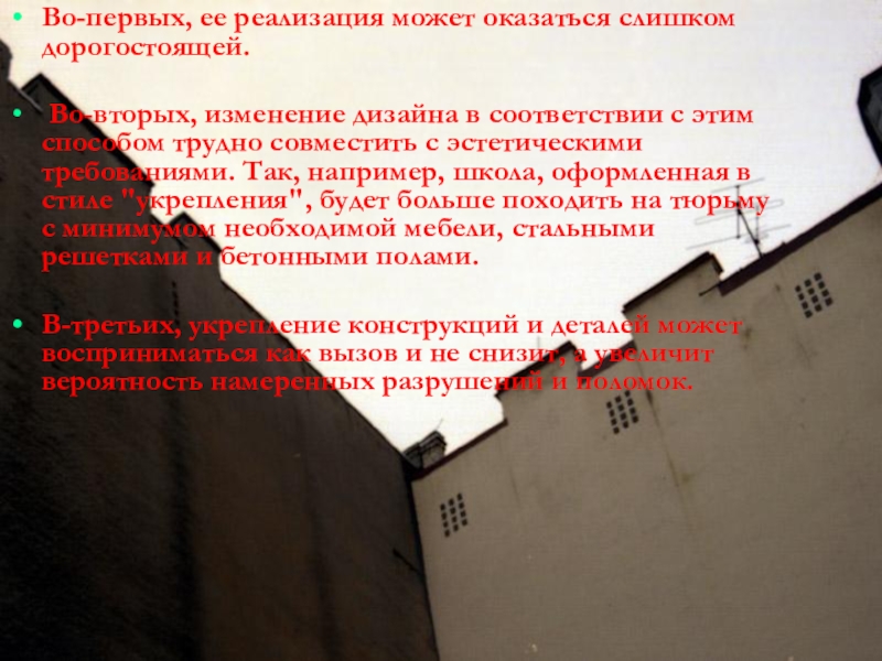 соответствии с этим способом трудно совместить с эстетическими требованиями. Так, например, школа, оформленная в стиле "укрепления", будет больше походить на тюрьму с минимумом необходимой мебели, стальными решетками и бетонными полами.