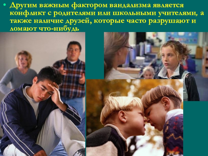 Слайд 48Другим важным фактором вандализма является конфликт с родителями или школьными учителями,
