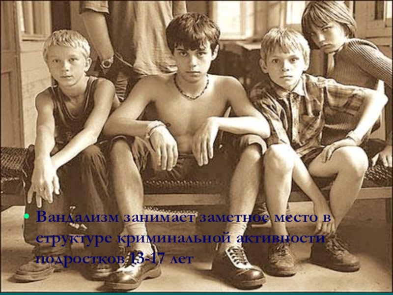 Слайд 52Вандализм занимает заметное место в структуре криминальной активности подростков 13-17 лет