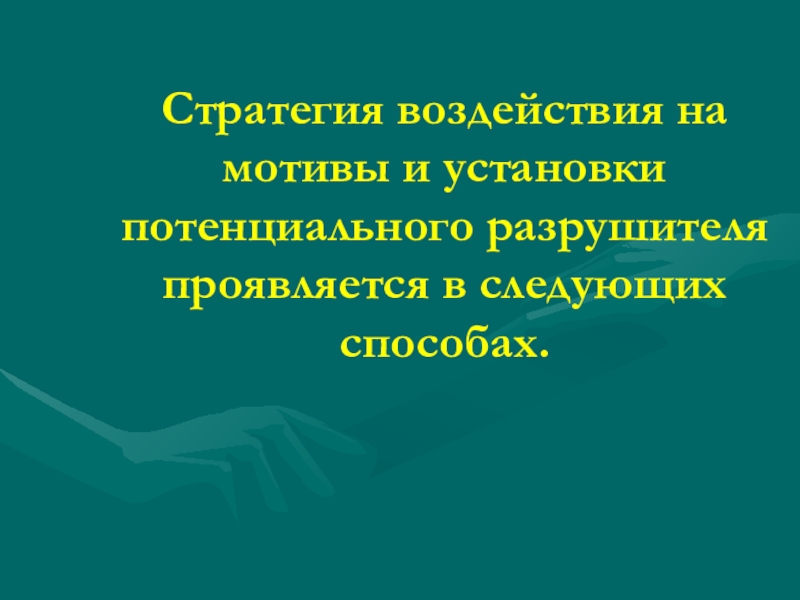 Слайд 62Стратегия воздействия на мотивы и установки потенциального разрушителя проявляется в следующих