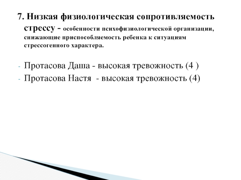 Слайд 87. Низкая физиологическая сопротивляемость стрессу - особенности психофизиологической организации, снижающие приспособляемость