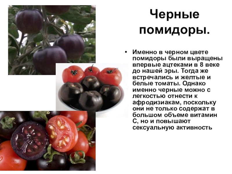 8 веке до нашей эры. Тогда же встречались и желтые и белые томаты. Однако именно черные можно с легкостью отнести к афродизиакам, поскольку они не только содержат в большом объеме витамин С, но и повышают сексуальную активность