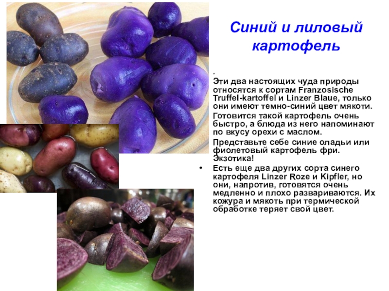 Есть еще два других сорта синего картофеля Linzer Roze и Kipfler, но они, напротив, готовятся очень медленно и плохо развариваются. Их кожура и мякоть при термической обработке теряет свой цвет.