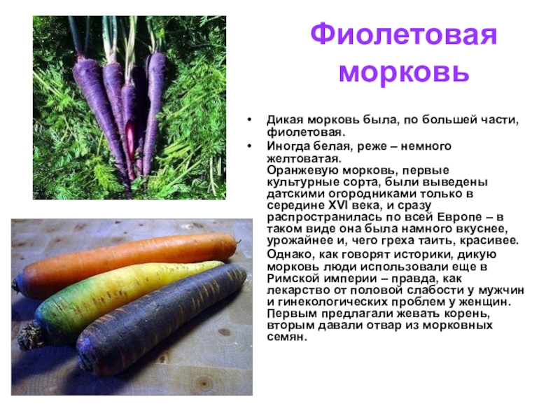 Однако, как говорят историки, дикую морковь люди использовали еще в Римской империи – правда, как лекарство от половой слабости у мужчин и гинекологических проблем у женщин. Первым предлагали жевать корень, вторым давали отвар из морковных семян.