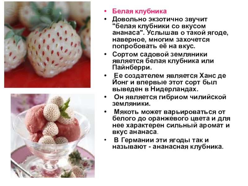 Сортом садовой земляники является белая клубника или Пайнберри.