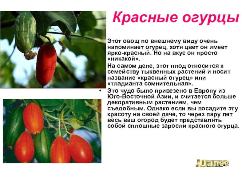 На самом деле, этот плод относится к семейству тыквенных растений и носит название «красный огурец» или «тладианта сомнительная».