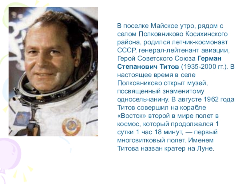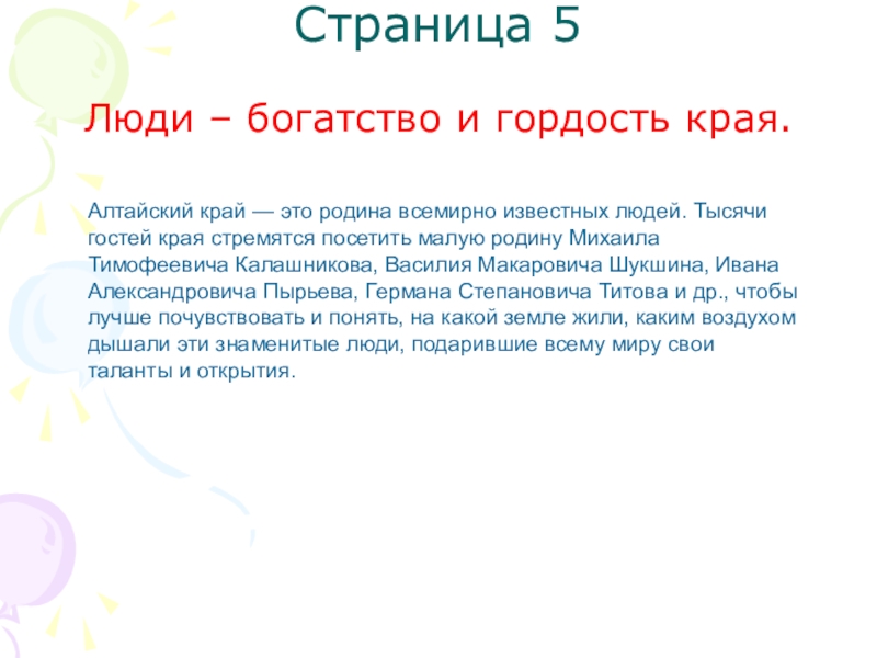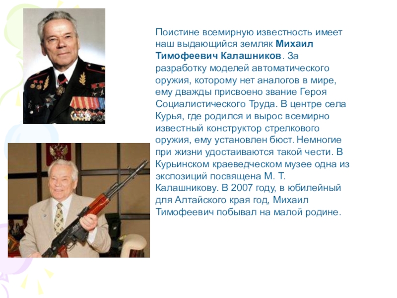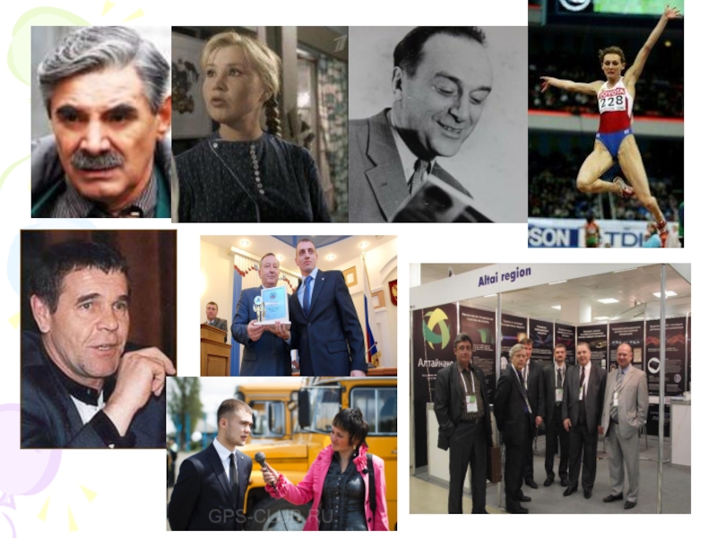 Алтайский край — это родина всемирно известных людей. Тысячи гостей края стремятся посетить малую родину Михаила Тимофеевича Калашникова, Василия Макаровича Шукшина, Ивана Александровича Пырьева, Германа Степановича Титова и др., чтобы лучше почувствовать и понять, на какой земле жили, каким воздухом дышали эти знаменитые люди, подарившие всему миру свои таланты и открытия.