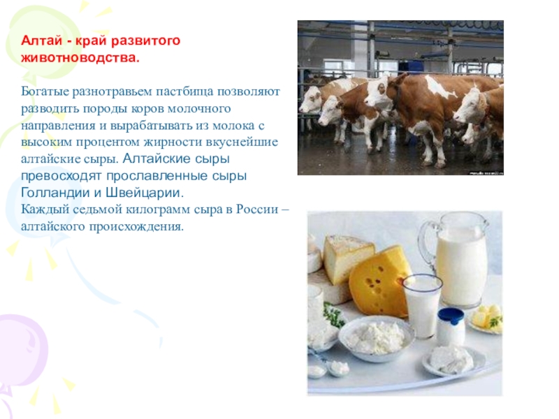 В крае много садов. Здесь выращивают различные сорта плодовых и ягодных культур. Хлеб, мясо, масло, сыр, сахар, мед, знаменитое целебное облепиховое масло, пушнину,