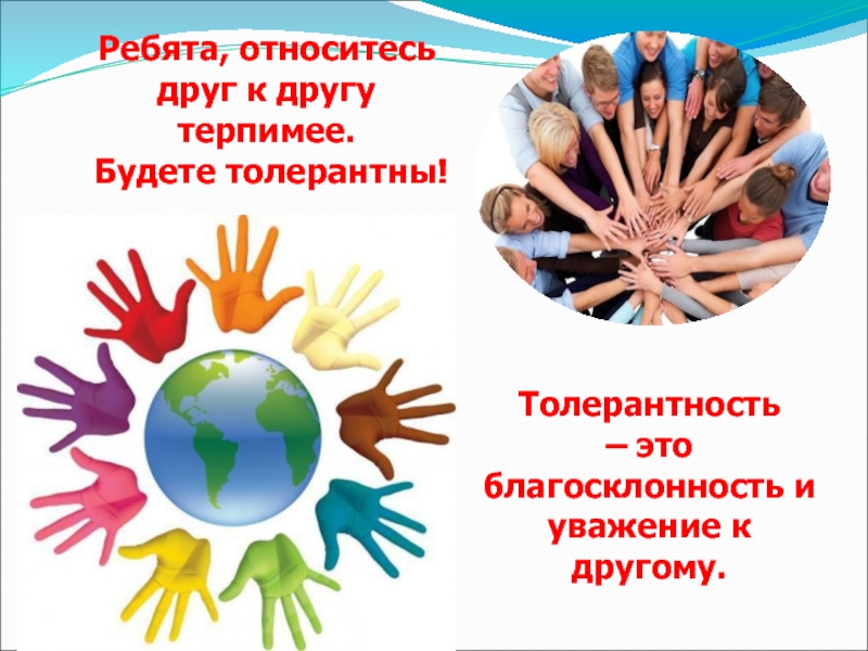 Толерантность – это благосклонность и уважение к другому. Ребята, относитесь друг к другу терпимее. Будете толерантны!