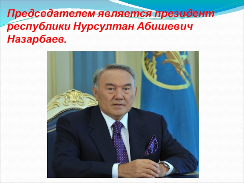 Слайд 4Председателем является президент республики Нурсултан Абишевич Назарбаев.